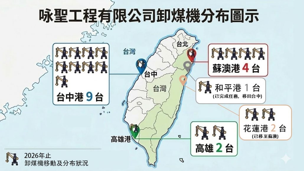 • 台中港: 部署 9 台 卸煤機。作為本公司的核心據點,台中港擁有全台最密集的設備編制,確保裝卸效率與產能極大化。